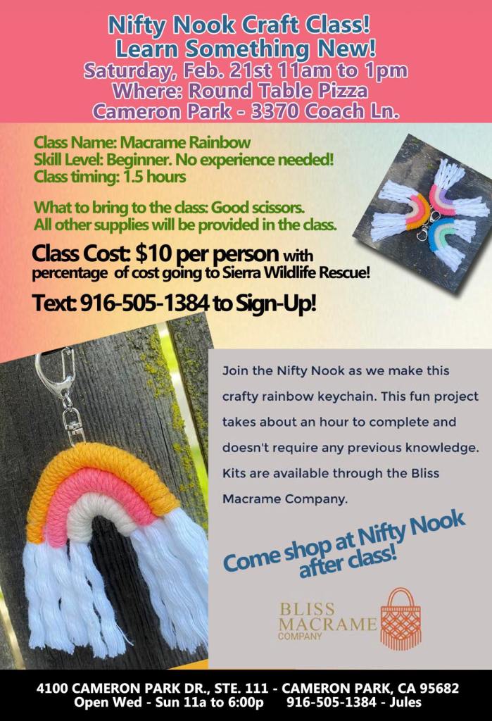 I love to share my love of making cool stuff with other crafters. Nifty Nook in Cameron Park, California is a great place to buy gifts and collectibles. They are also a great place to learn something new. Besides shopping at this one-of-a-kind store, you can also make your own creations. Julie, the store owner will be hosting me as I show you how to make a Macramé Rainbow Keychain this month.